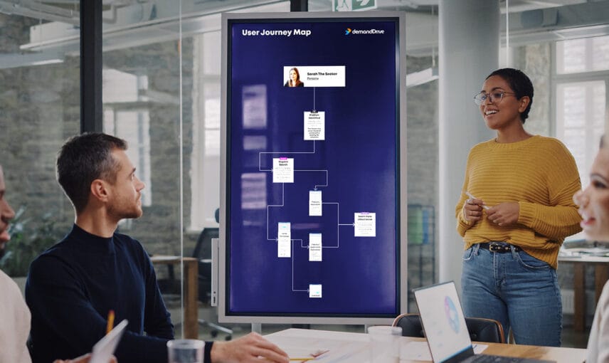 Team discussing a user journey map displayed on a large screen in a modern office setting.